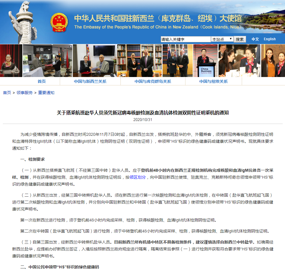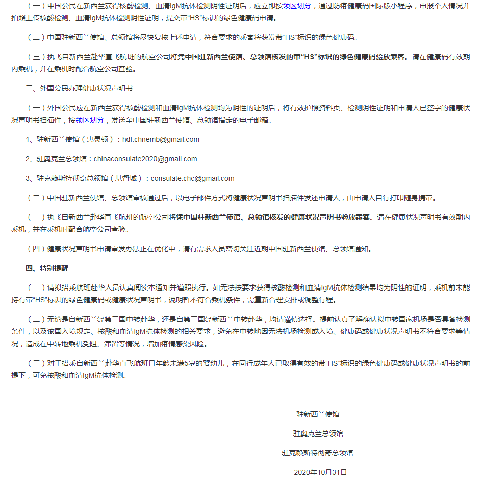 (一)外国公民应在新西兰获得核酸检测和血清IgM抗体检测均为阴性的证明后,将有效护照资料页、检测阴性证明和申请人已签字的健康状况声明书扫描件,按领区划分(请识别后附二维码),发送至中国驻新西兰使馆、总领馆指定的电子邮箱。
