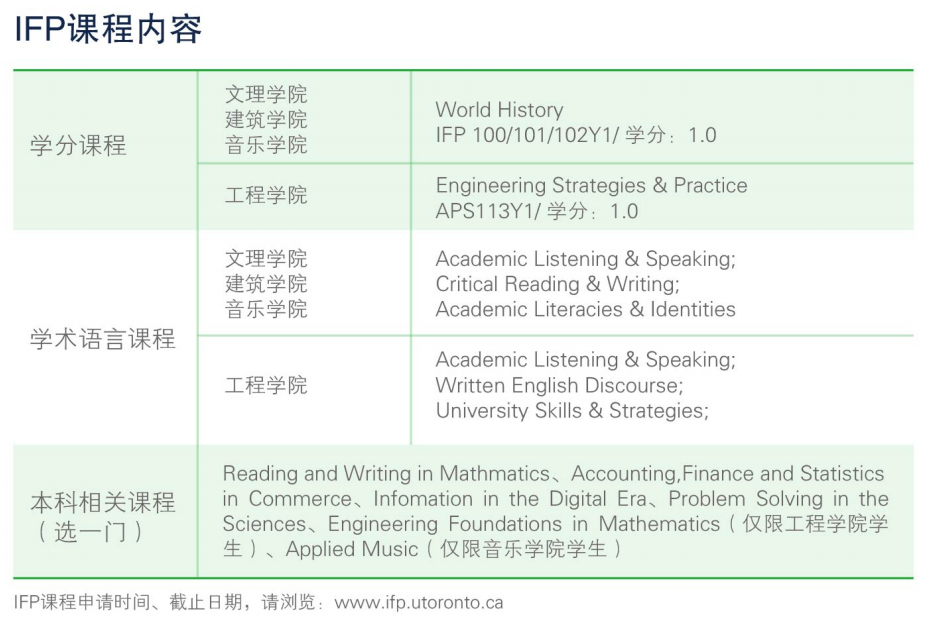大志君刚刚收到消息,多伦多大学圣乔治主校区开设了本科预科项目(IFP),全称International Foundation Program,为主要针对高中学术成绩达到多伦多大学入学要求,但语言成绩达不到直录的学生,专门开设的本科预科项目,学生通过就读语言课程及大学学分课程,从而衔接多伦多大学的大一课程。 多伦多大学创立于1827年,拥有17类大学学院,13个教学医院,19个研究所,及75类博士级研究学科,为世界著名的研究性大学。杰出校友包括4位加拿大总理,14位最高法院大法官及6名诺贝尔奖得主。根据《纽约时报》高等教育世界大学排名,QS世界大学排名和上海交通大学世界大学学术排名,多伦多大学均荣获加拿大排名第一。多伦多大学有超过80,000名学生,其中包括10,000余名国际学生,为加拿大规模最大的大学,更是国家高等教育的翘楚。 多伦多大学的圣乔治校区(St.George Campus)座落于多伦多的市区中心,是多伦多大学所属三个校区中,最大的一个校区。多伦多市中心的多元文化及圣乔治校区的国际声望,吸引了众多世界知名的教授及全球优异的学生。 Faculty of Arts & Science 多伦多大学的文理学院是由一群多样性且致力于追求卓越的学者和学生,所组成的活跃智慧团体。文理学院的3万余名学生,来自140多个国家,占多伦多大学主校区总学生人数的一半,也是全加拿大最大的学院。因拥有优质的师资,包含930名一流教授、2300多名助教、教师、及研究人员,多伦多大学的文理学院被公认为北美最完善的院系之一。 Faculty of Applied Science & Engineering 多伦多大学工程学院是加拿大排名第一,历史最悠久的工程学院。工程学院是个培育灵感,创意出众,及充满无限发展空间的学术单位。工程学院的一流教育和学术研究,在国际上享有极高声誉,其前瞻性的思维,被视为解决全球最急迫问题的重要资源。透过创新的教育及协力的研究与设计,工程学院得以培育出全方位的顶尖学生,更有机会在毕业后,取得注册专业技师(P.Eng.)的资质。 John H. Daniels Faculty of Architecture, Landscape, & Design John H.Daniels建筑学院是建筑、景观和设计领域的一流学院。透过跨科培训和国际研究,建筑学院为那些梦想成为建筑师、景观设计师、或城市规划师的学生,提供顶级的教育资源和环境。利用多伦多市的多元文化,建筑学院培育并挑战学生的创意,进而激发他们21世纪的新设计观念。 多伦多大学的音乐学院是由众多活跃于音乐领域的表演者,学者,作曲家和教育家所组成。音乐学院开设演奏(古典和爵士乐),音乐教育,音乐创作,音乐历史及音乐理论等多种专业。透过小班制及个人辅导,每个学生均能受到国际著名音乐家授予的顶级教育。在校期间,学生将有多次舞台表演的机会。音乐学院教员所创作的音乐和对文化的贡献,使本学院成为音乐学术和研究等领域的翘楚。在多伦多市丰富的文化环境中,音乐学院提供立志成为音乐家的学生,一个非常理想的成长环境。 IFP课程(International Foundation Program)是一个结合有条件入学,英语课和必修课的密集型课程。专为在校成绩优异,但英语水平未能达到多伦多大学入学标准的高中应届毕业生所设计。IFP课程顺利完成后,即可继续就读他们所申请的文理学院、工程学院、建筑学院或音乐学院。 提供文学士,理学士及商学士学位。专业涵盖:人类学、经济学、地理信息系统、健康研究、国际关系、政治学、生物化学、生物医学与毒物学、细胞与分子生物、环境与能源、环境科学、免疫学、营养学、药剂学、心理学、计算机、精算、应用数学、数学、应用统计、化学、物理、经济学与数学、金融经济学、材料科学、会计、金融与经济、管理学等。 -
